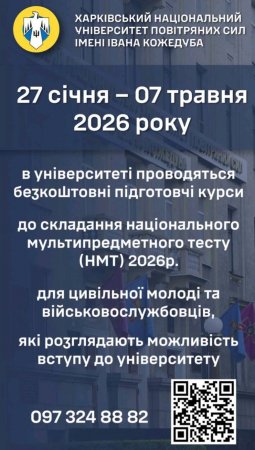 Харківський національний університет Повітряних Сил імені Івана Кожедуба з метою проведення профорієнтаційної роботи та інформування молоді про можливості здобуття військової освіти повідомляє про заплановані заходи у січні 2026 року, а саме: