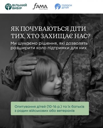 Шановні батьки! Запрошуємо вас та ваших дітей долучитися до важливого опитування серед сімей ветеранів та ветеранок, а також військовослужбовців і військовослужбовиць.